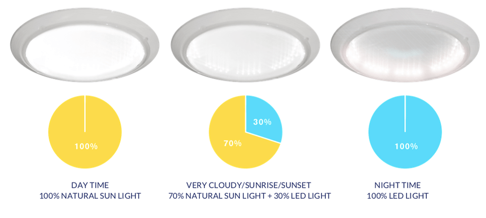 This innovative sun tunnel skylight system is ideal for warehouses, factories, and pavilions where Lumina AllDay tunnel can provide efficiently healthy light, reducing the energy bill considerably at the end of the month. This is possible because the Lumina AllDay smart unit prioritizes the natural lighting from the Sun Tunnel, complementing it by the led light only in the necessary quantity, maintaining the desired lighting level for the location.