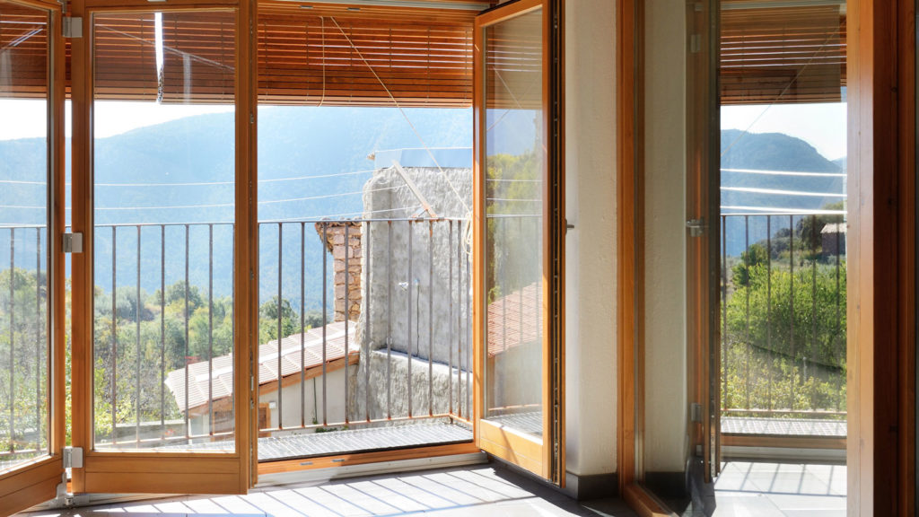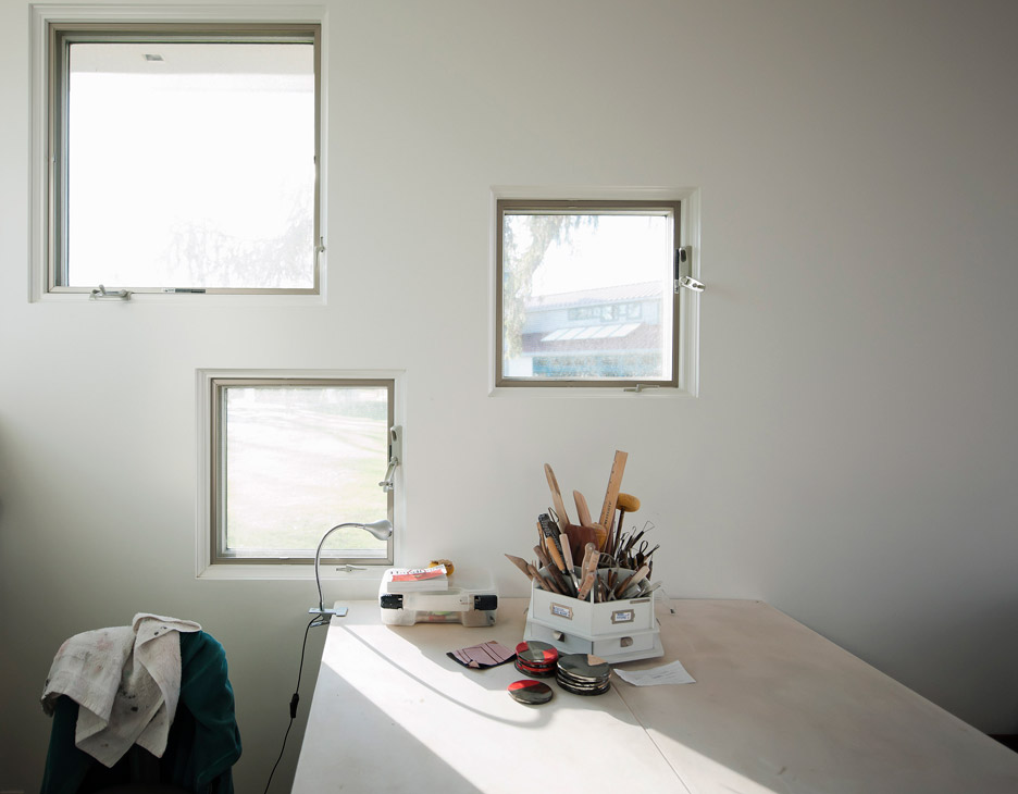 The other โ which contains a ceramics studio for โherโ โ has a wood frame with cedar siding and punched windows.