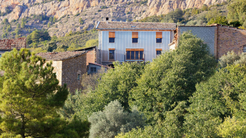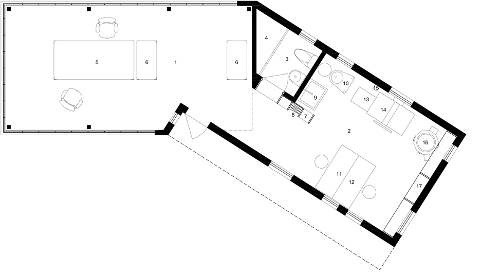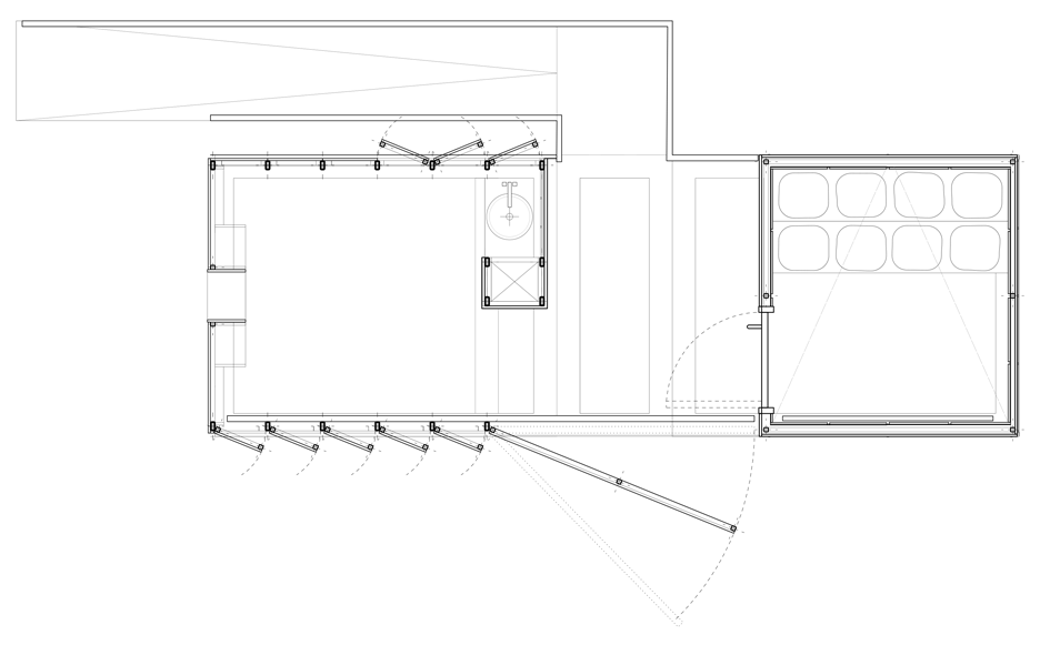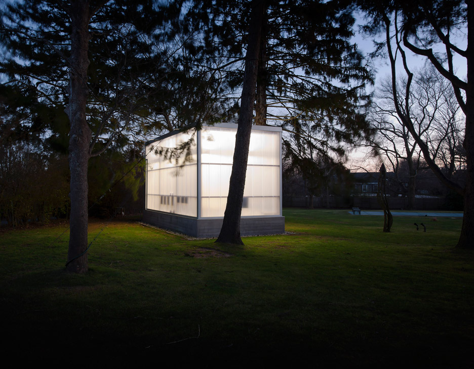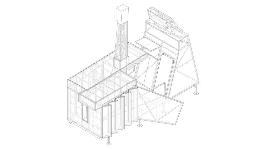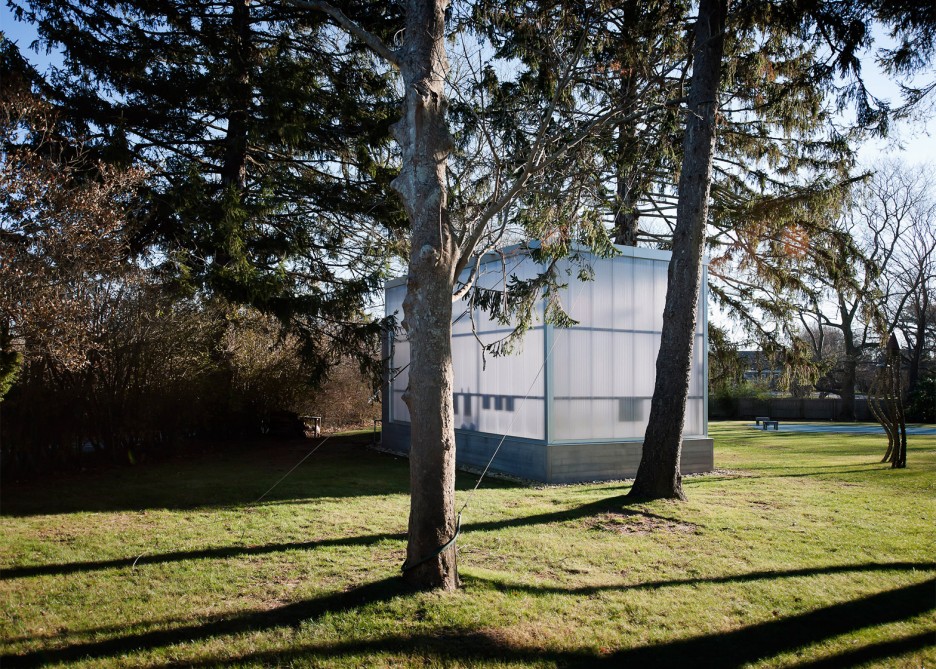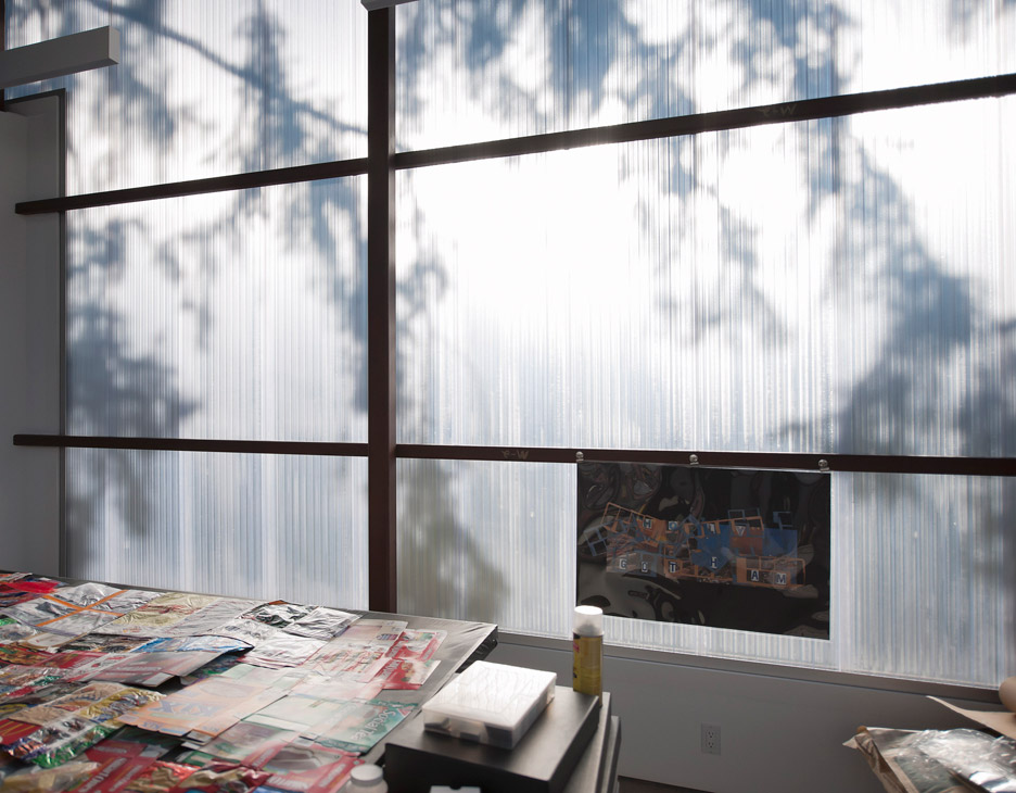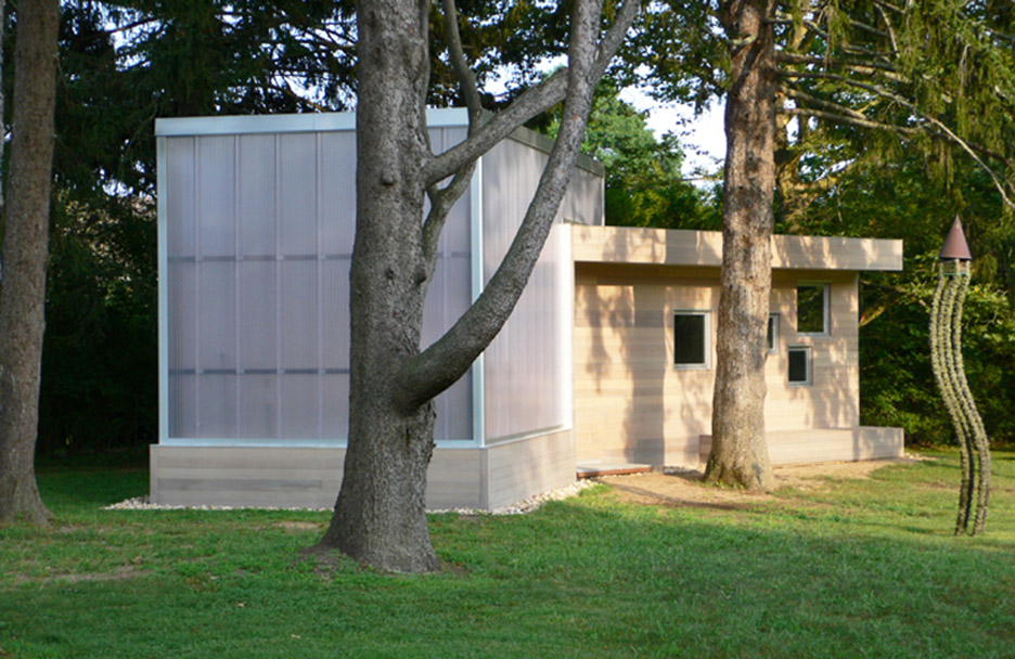 The building consists of two intersecting volumes. One features a steel frame and polycarbonate walls and houses a collage studio for โhisโ work.